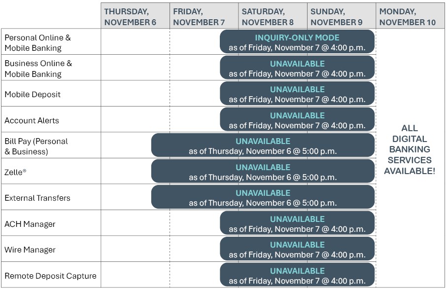 Our digital banking upgrade will kick off on Thursday, November 6, with completion anticipated by Monday, November 10. During this time, some features may experience temporary service interruptions. To help you stay informed and prepared, please review the key dates and times outlined below. All times shown below are Central Standard Time (CST).