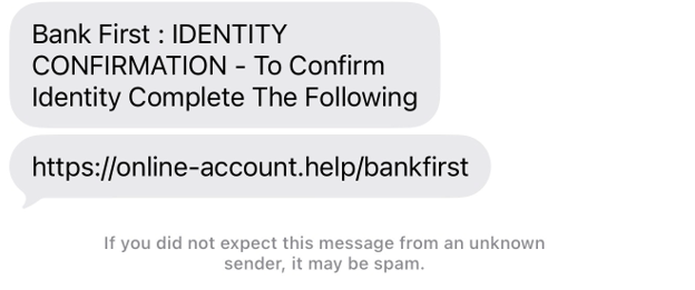 The example below shows a scam text. It may look convincing, but it did not come from Bank First.